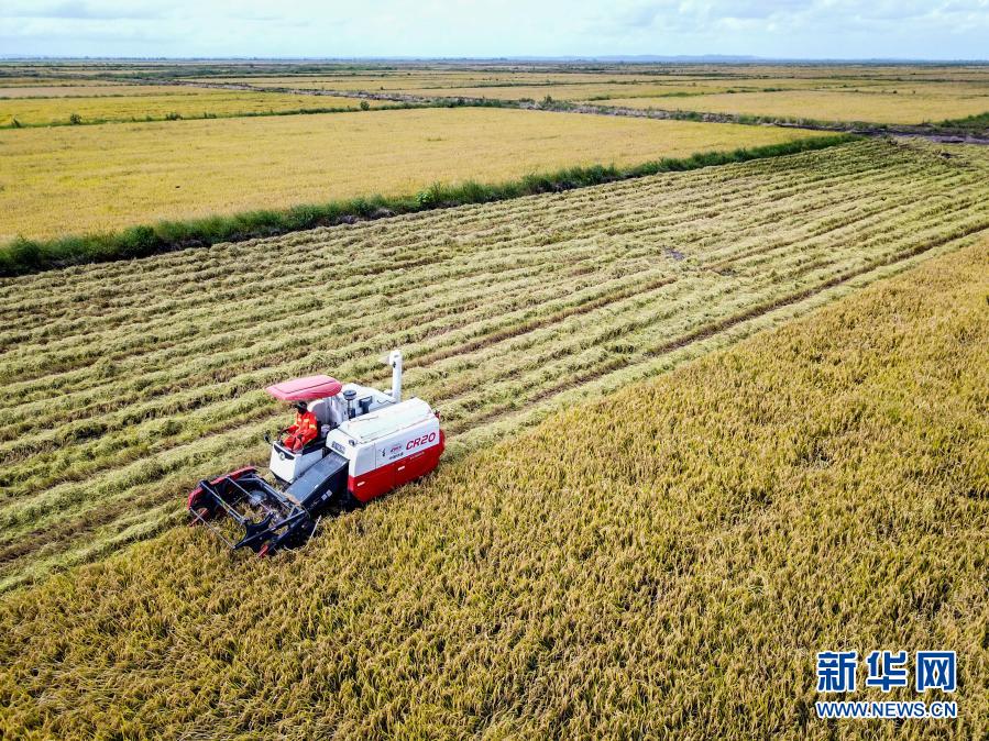 2019年4月7日,收割机在莫桑比克万宝莫桑农业园内收割水稻(无人机拍摄)。