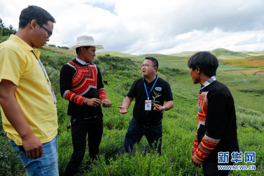 2020年8月14日,在位于四川省凉山彝族自治州昭觉县龙沟乡境内的海拔2850米的波火尔且高山坡地上的黄芩种植基地,西南医科大学副教授夏纪毅(右二)和该校派出的驻村工作队员俄且莫机(左一)为当地彝族群众讲授黄芩种植和采摘技术。