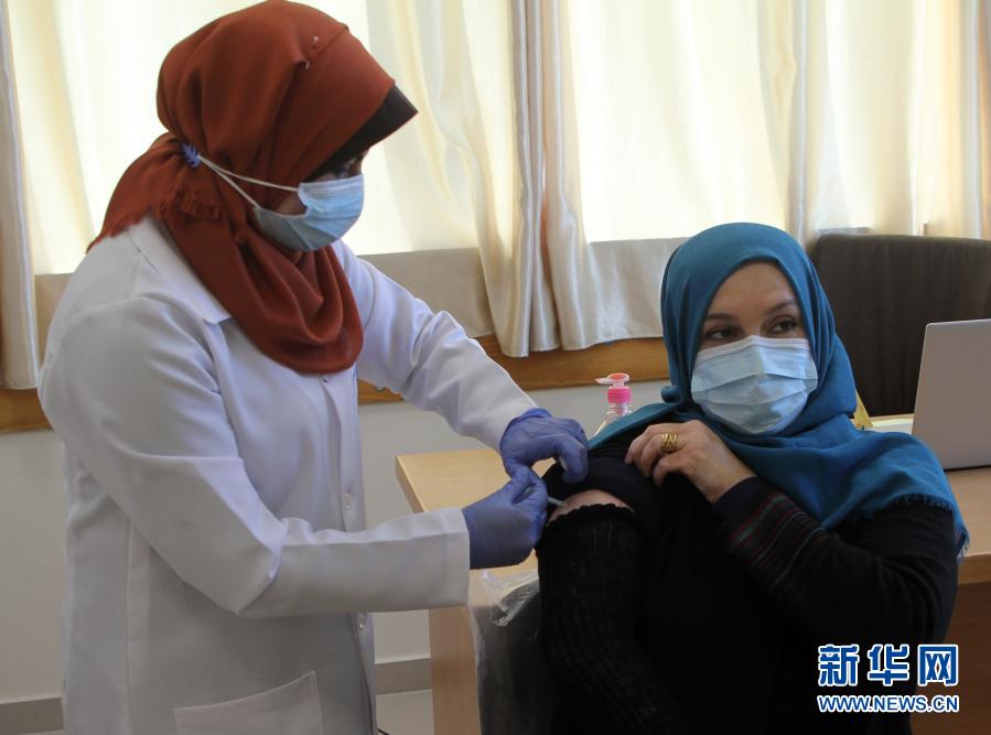 2月28日,一名巴勒斯坦医护人员(右)在加沙城接种新冠疫苗。