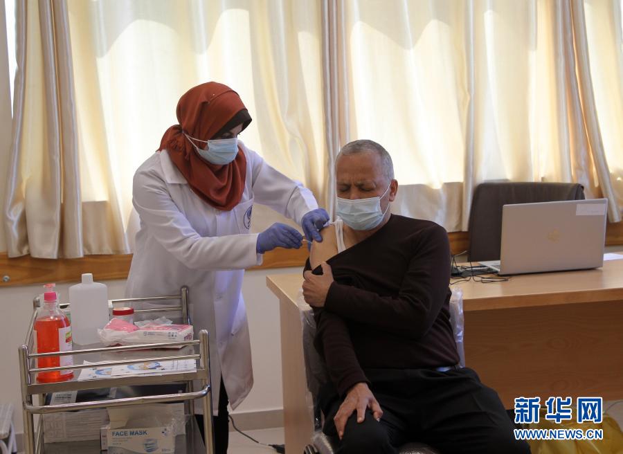 2月28日,一名巴勒斯坦医护人员(右)在加沙城接种新冠疫苗。