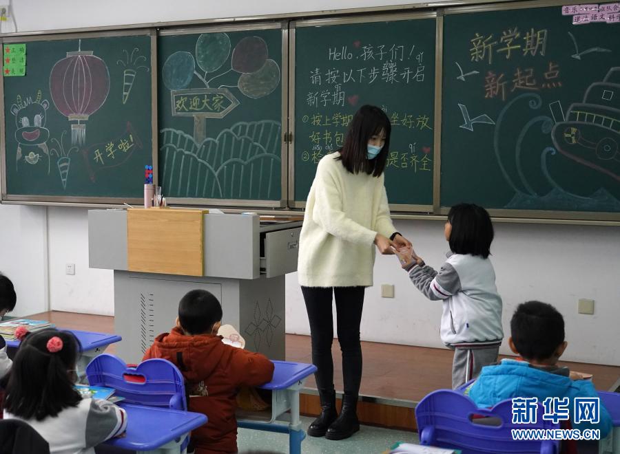 3月1日,北京小学大兴分校亦庄学校的老师向学生发放新学期寄语卡。