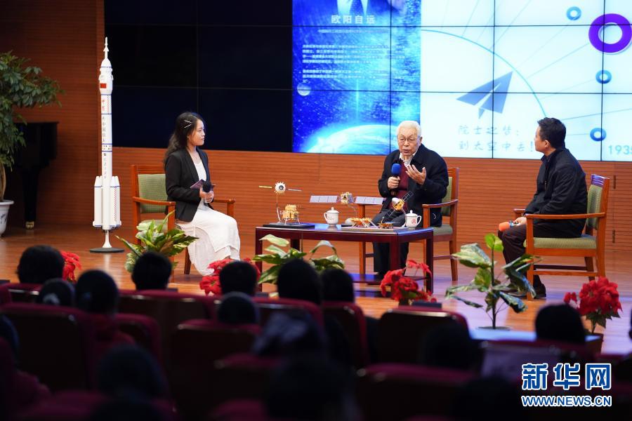 3月1日,在北京师范大学附属实验中学的“开学第一课”活动上,中国科学院院士、中国月球探测工程首任首席科学家欧阳自远(中)讲述个人成长经历。