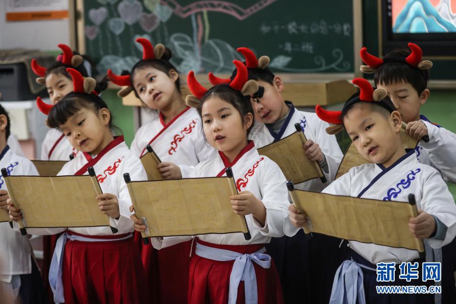 3月1日,辽宁省沈阳市和平一校长白岛一分校1年级2班的学生在上开学第一课。学生代表进行了传统文化节目表演。