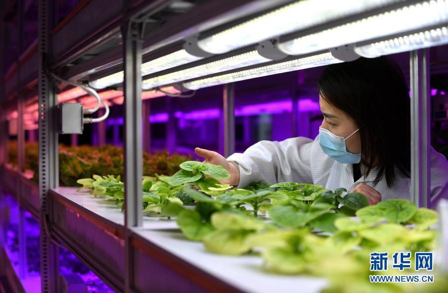 2月23日,在保定·中关村创新中心,工作人员检查在LED人工光照下蔬菜的生长状况。新华社记者 王晓 摄