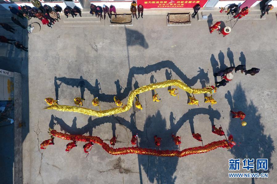 在山西省灵丘县岸底村,村民们在村委大院里排练舞龙节目(2月25日摄,无人机照片)。新华社记者 詹彦 摄