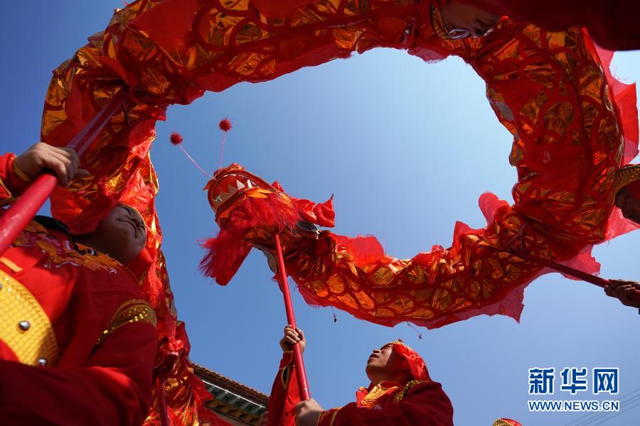 在山西省灵丘县岸底村,村民在排练舞龙节目(2月25日摄)。新华社记者 詹彦 摄