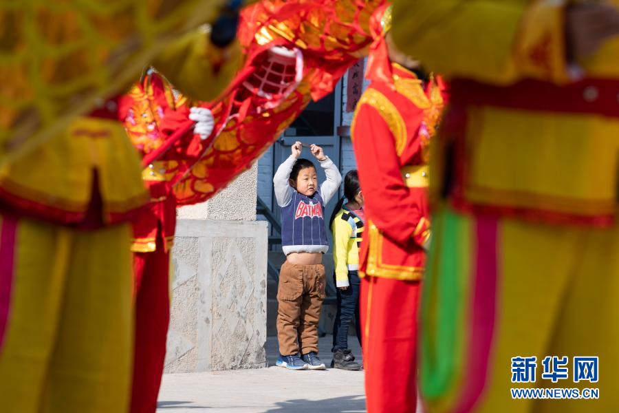 在山西省灵丘县岸底村村委大院,小朋友在观看舞龙舞狮节目排练(2月25日摄)。新华社记者 杨晨光 摄
