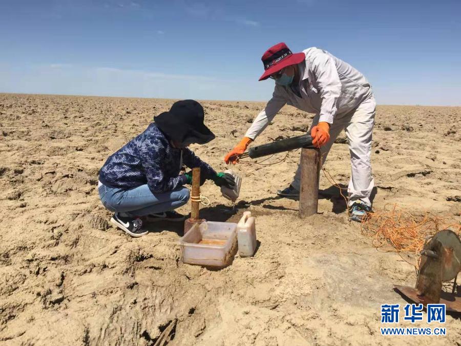 盐湖集团研发中心工程师张娟(左)在盐碱地中的采样点采样(资料照片)。新华社发