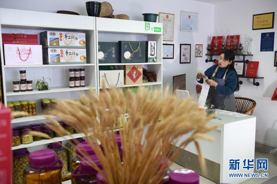 张志菊在自己的土特产店里打印快递单(2月27日摄)。