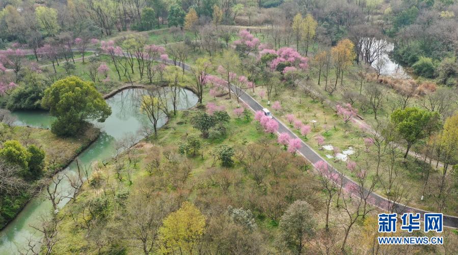 3月2日,观光车在西溪湿地内行驶(无人机照片)。