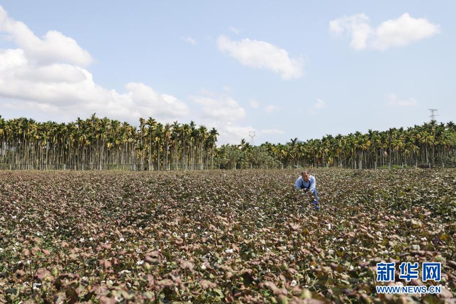 2月28日,在三亚南繁育种基地的棉田里,赵国忠在查看棉花长势。新华社记者 张丽芸 摄