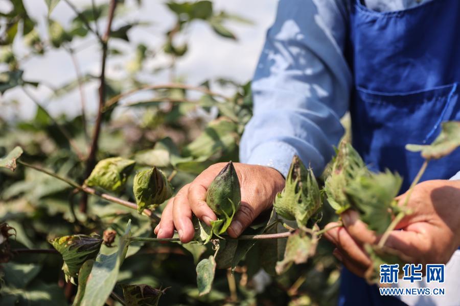 2月28日,在三亚南繁育种基地的棉田里,赵国忠在查看棉花长势。新华社记者 张丽芸 摄