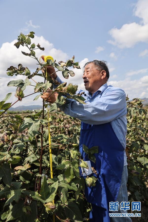 2月28日,在三亚南繁育种基地的棉田里,赵国忠给棉花测量高度。新华社记者 张丽芸 摄