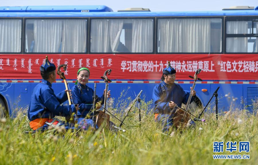 2018年9月13日,在内蒙古自治区锡林郭勒盟镶黄旗宝格达音高勒苏木浩尼钦哈夏图嘎查的一处草场,镶黄旗乌兰牧骑的队员在为牧民演奏马头琴。新华社记者 彭源 摄