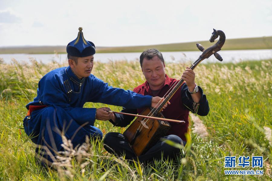 2018年9月13日,在内蒙古自治区锡林郭勒盟镶黄旗宝格达音高勒苏木浩尼钦哈夏图嘎查的一处草场,演出结束后,镶黄旗乌兰牧骑的队员教牧民拉马头琴。新华社记者 彭源 摄