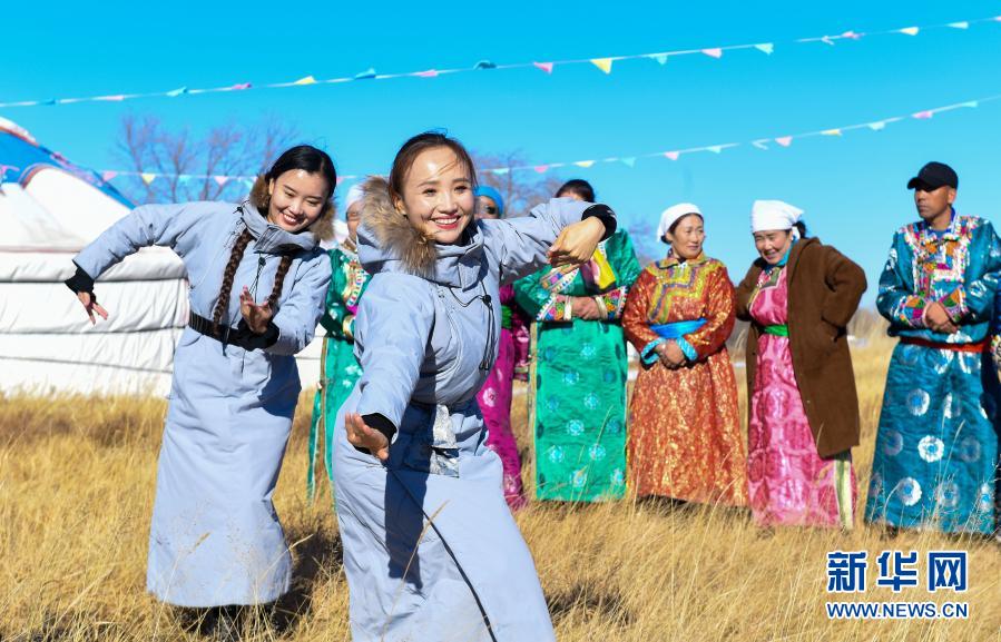 2018年11月9日,内蒙古自治区锡林郭勒盟乌兰牧骑队员来到西乌珠穆沁旗乌兰哈拉嘎苏木新高勒嘎查的党员中心户恩克巴雅尔家,为周边牧民表演舞蹈。新华社记者 彭源 摄