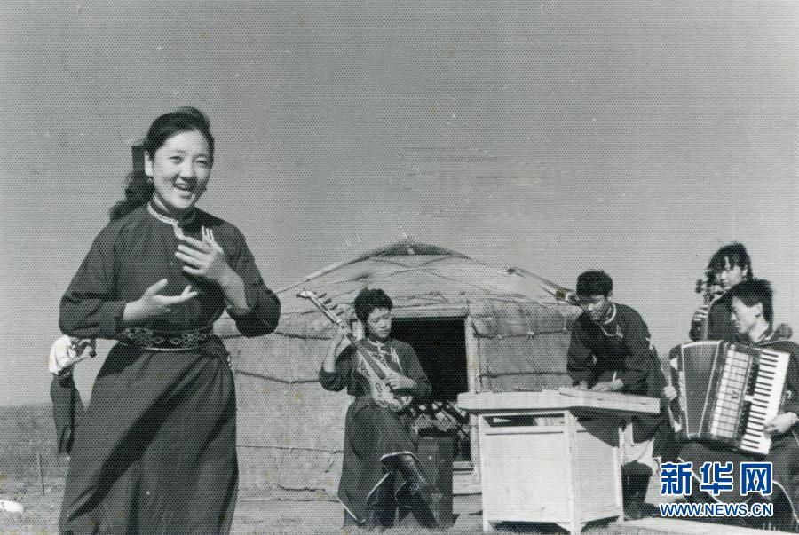 20世纪六七十年代,内蒙古自治区锡林郭勒盟苏尼特右旗乌兰牧骑队员在草原上为周边牧民表演节目(资料照片)。新华社发