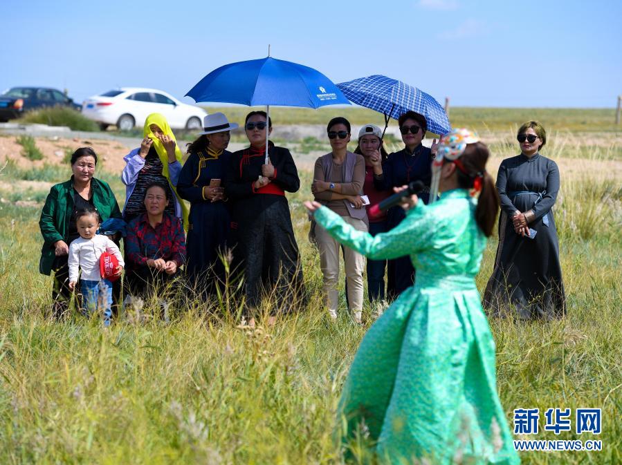 2018年9月13日,在内蒙古自治区锡林郭勒盟镶黄旗宝格达音高勒苏木浩尼钦哈夏图嘎查的一处草场,镶黄旗乌兰牧骑的队员在为牧民表演文艺节目。新华社记者 彭源 摄
