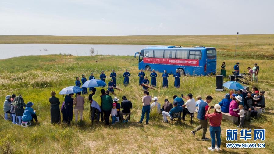 2018年9月13日,在内蒙古自治区锡林郭勒盟镶黄旗宝格达音高勒苏木浩尼钦哈夏图嘎查的一处草场,镶黄旗乌兰牧骑的队员在为牧民表演文艺节目(无人机照片)。新华社记者 彭源 摄