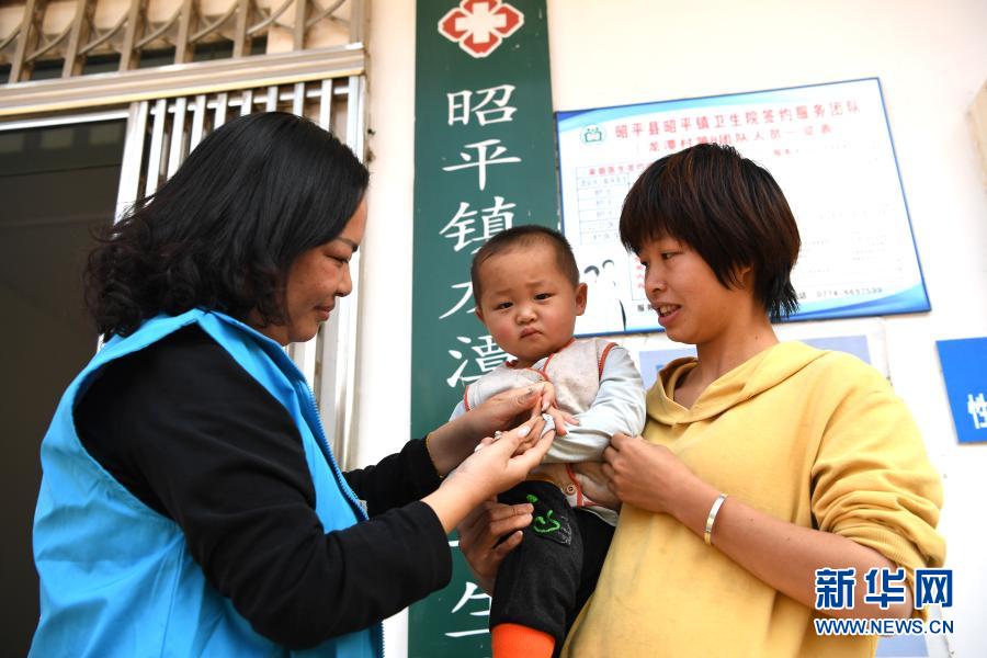 陈坤在广西贺州市昭平县昭平镇龙潭村卫生室前查看一名儿童的指缝(2月23日摄)。新华社记者 周华 摄