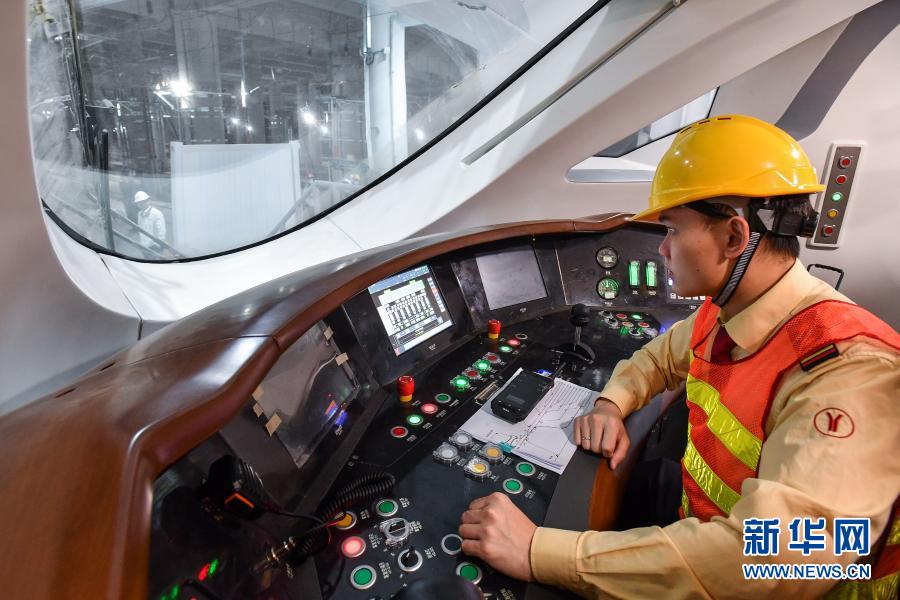 3月3日,参加热滑试验的地铁驾驶员在广州地铁18号线时速160公里电客车驾驶室做发车准备。