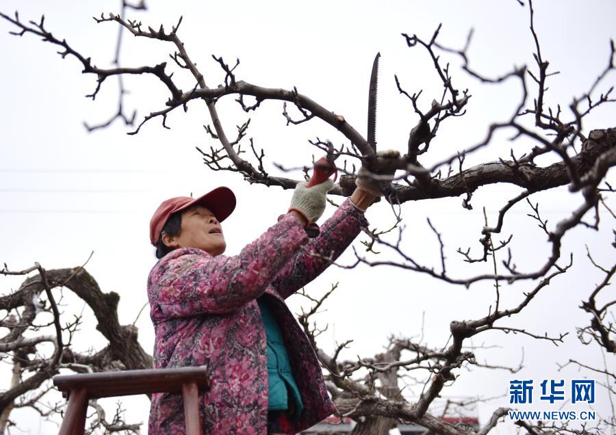 3月3日,河北省阜城县霞口镇刘老人村果农在梨园给梨树修剪枝条。
