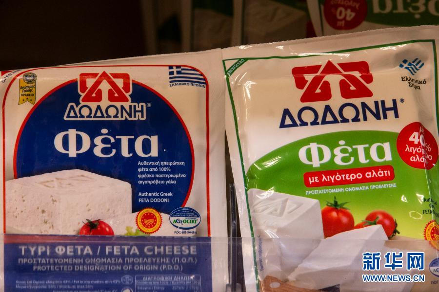 这是3月2日在希腊首都雅典商店内拍摄的不同品牌的菲达奶酪。希腊的菲达奶酪是中欧地理标志协定中首批受保护的欧盟地理标志产品。