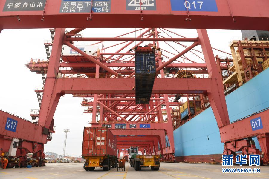 3月3日,一艘停靠在宁波舟山港的货轮进行集装箱装运。