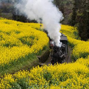 3月2日,一列嘉阳小火车经过菜子坝附近的花海。