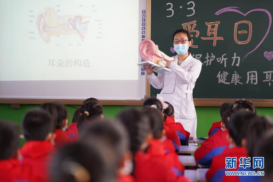 3月3日,在河北省邢台市内丘县大良村小学,医护人员为学生讲解爱耳护耳知识。
