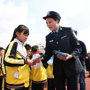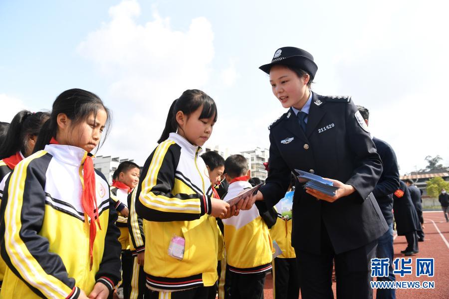 3月3日,民警在活动中给小学生发放安全宣传资料。