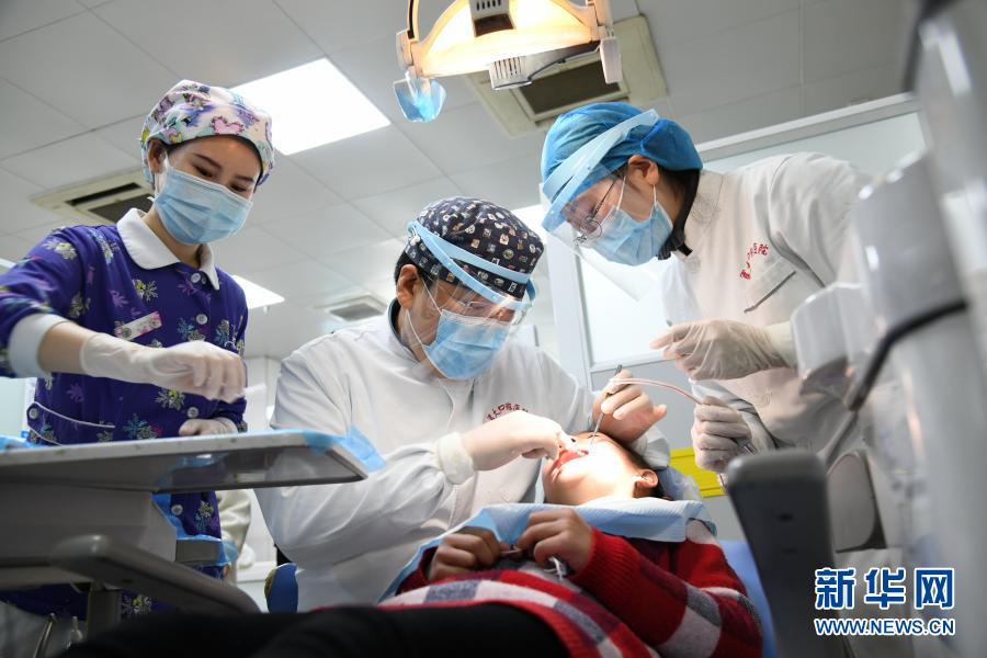 3月3日,在空军军医大学口腔医院,口腔预防科主任轩昆(左二)为党雯琦(左三)做口腔诊疗。