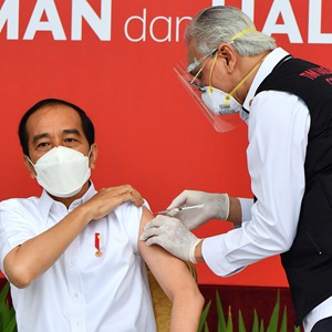 1月13日,印度尼西亚总统佐科(左)在雅加达总统府接种中国新冠疫苗。新华社发(印尼总统府供图)