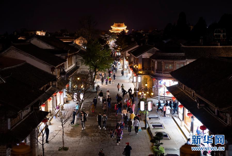 夜幕下的大理古城灯火璀璨,舒适的气候、美丽的景色和独特的建筑风貌等吸引各地游客汇集于此感受古城魅力。