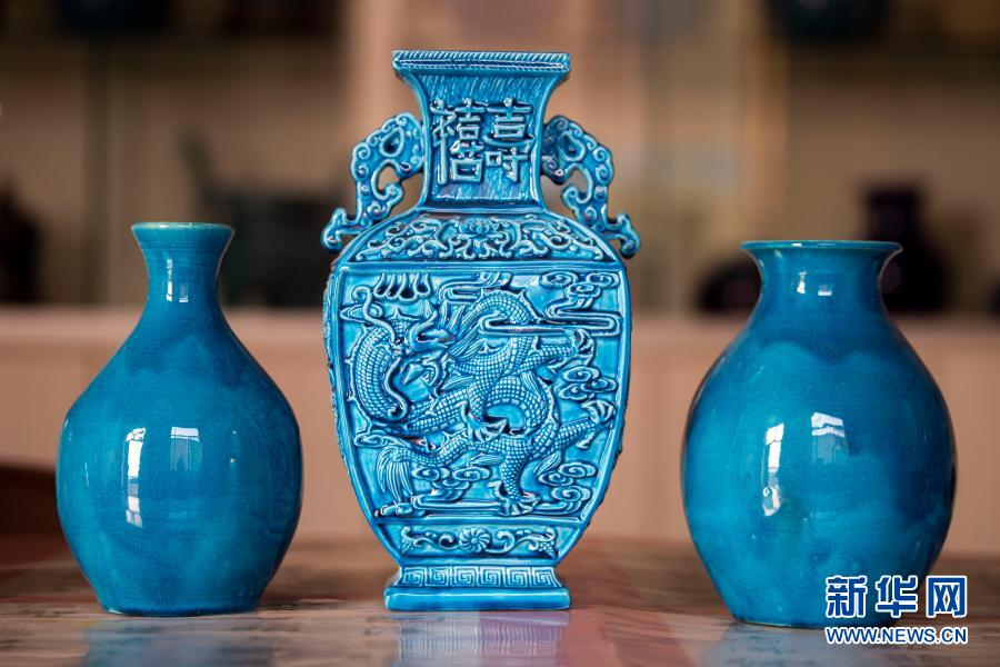 这是3月3日在葛原生工作室拍摄的孔雀蓝琉璃工艺品。新华社记者 杨晨光 摄