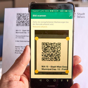 这是3月3日在奥地利维也纳拍摄的正在扫描新冠检测结果二维码的手机。