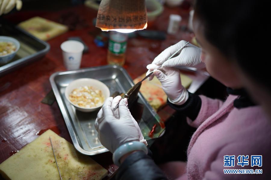在万年县湖云乡塔江村一处珍珠养殖基地内,珍珠养殖户手把手培训一位贫困户进行插核(3月3日摄)。新华社记者 周密 摄