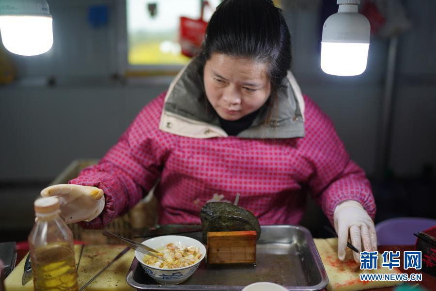 在万年县湖云乡塔江村一处珍珠养殖基地内,女工进行插核(3月3日摄)。新华社记者 周密 摄