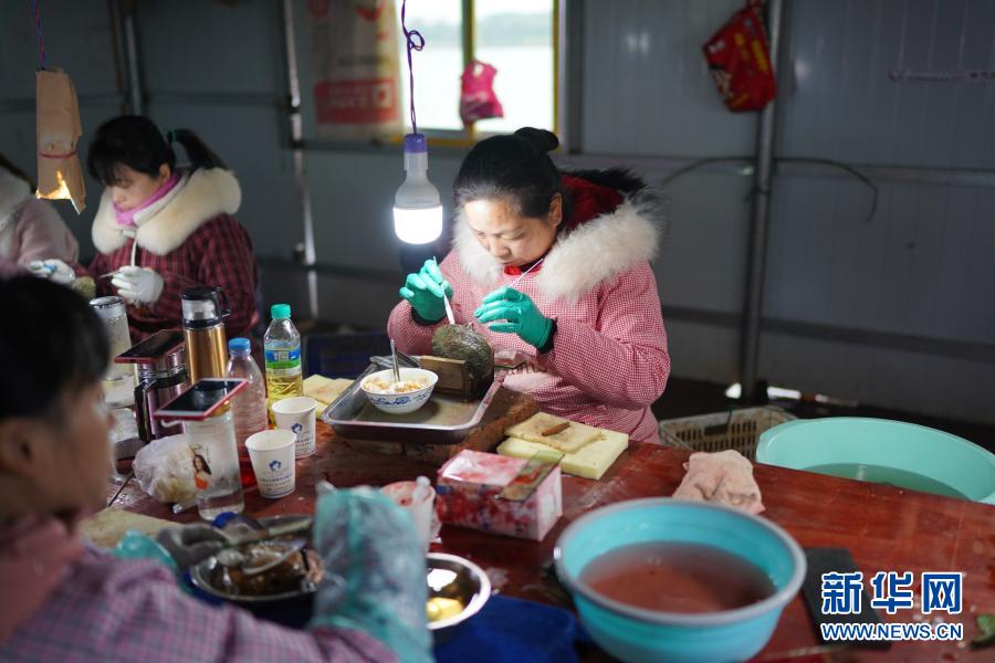 在万年县湖云乡塔江村一处珍珠养殖基地内,女工小心地撬开珠蚌进行插核(3月3日摄)。新华社记者 周密 摄