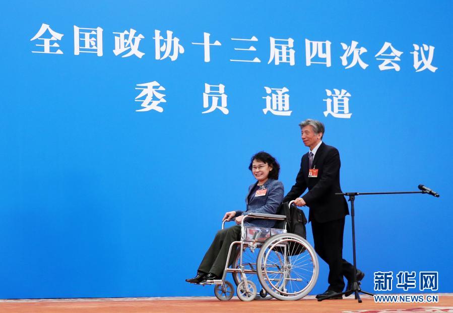 3月4日,全国政协十三届四次会议第一场“委员通道”采访活动在北京人民大会堂新闻发布厅举行。这是采访活动结束后,全国政协委员范迪安推着全国政协委员张海迪离开会场。
