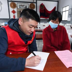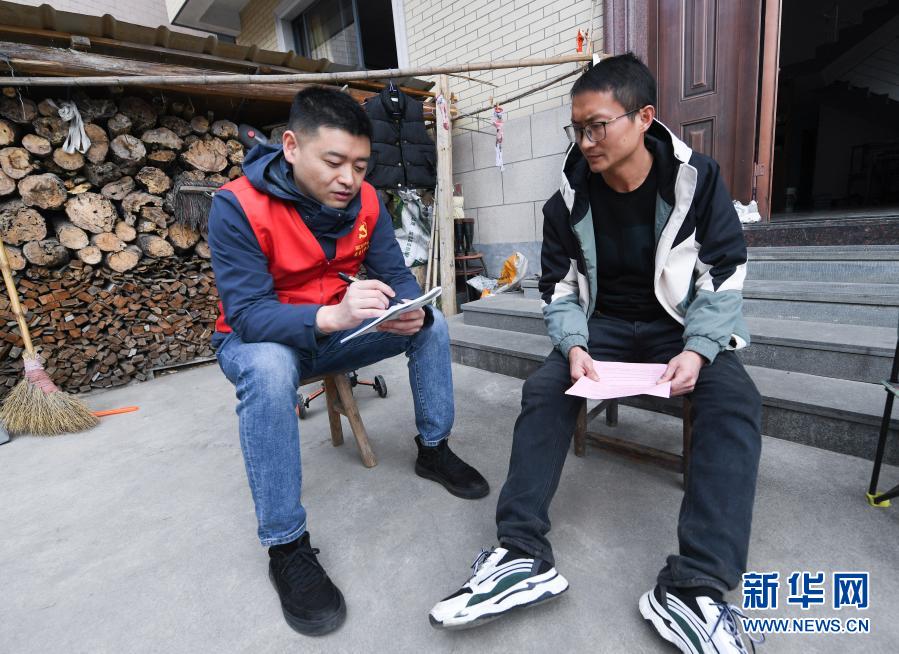 3月4日,在浙江省杭州市临安区湍口镇迎丰村一户村民的院子里,党员志愿者(左)在了解村民有关土地承包的问题及意见。