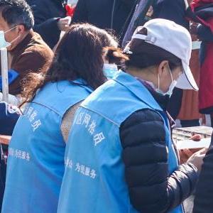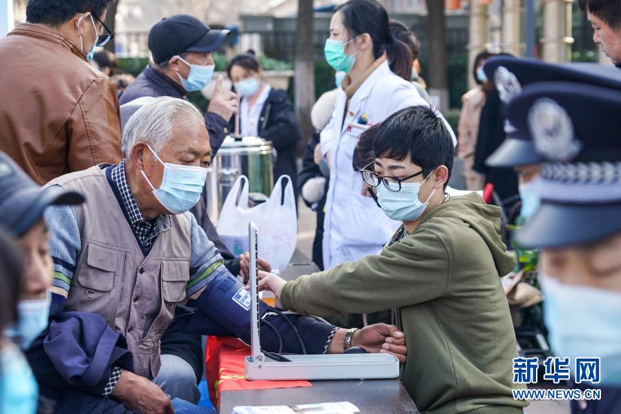 3月4日,江苏省第二中医院的志愿者在为社区居民测量血压。
