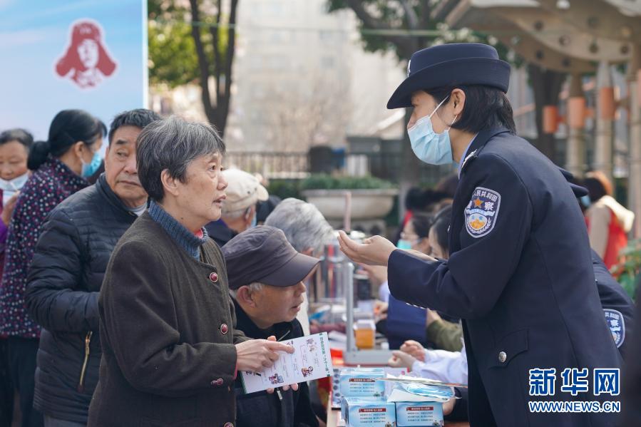 3月4日,南京建邺公安分局的民警在活动现场讲解防电信诈骗知识。