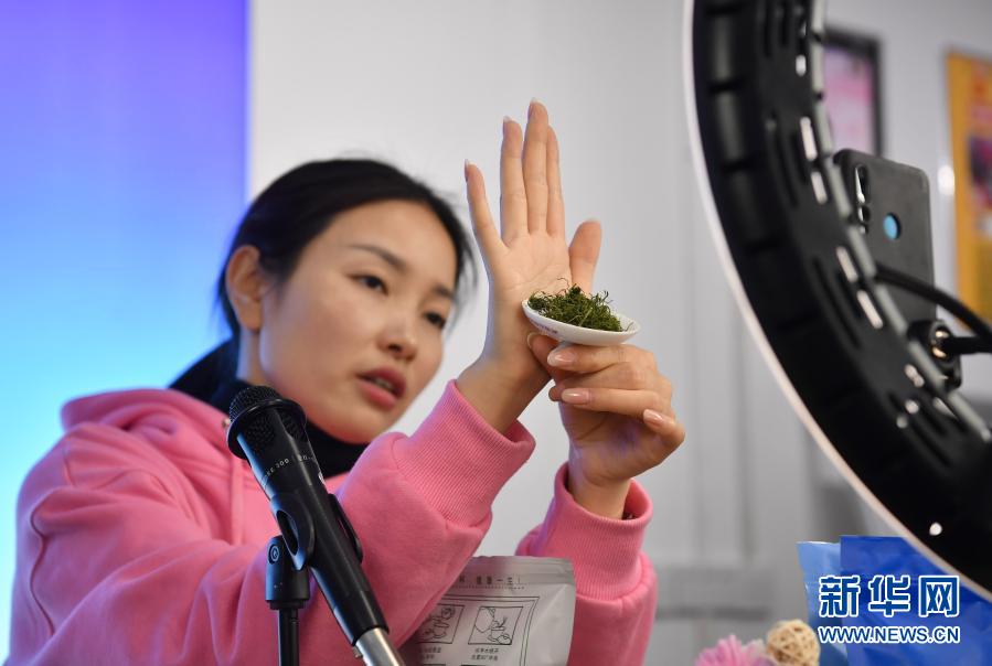 3月2日,在位于平利县城关镇的公司直播间内,王秀梅在直播中推介绞股蓝茶产品。新华社记者 邵瑞 摄