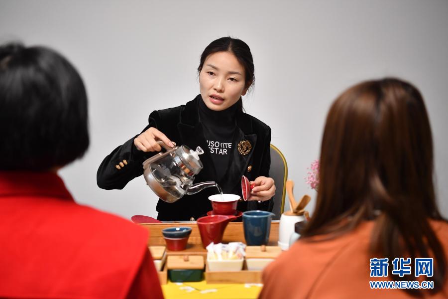 3月2日,在位于平利县城关镇的公司办公室内,王秀梅(中)在向负责电商直播的员工教授茶艺。新华社记者 邵瑞 摄