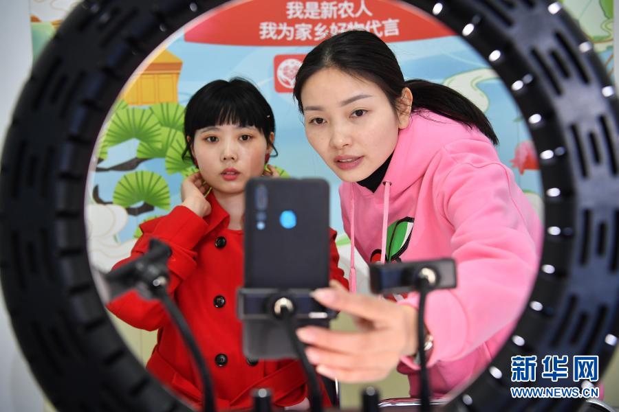 3月2日,在位于平利县城关镇的公司直播间内,王秀梅(右)在向员工讲解直播前的准备工作。新华社记者 邵瑞 摄