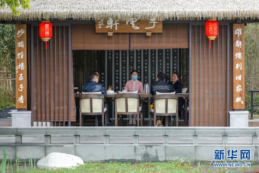 在位于岷江村的岷江书院,陶勋花(右一)与参观者一边品茶,一边介绍岷江书院致力于地域文化研究与传承的情况(2月26日摄)。新华社记者 沈伯韩 摄
