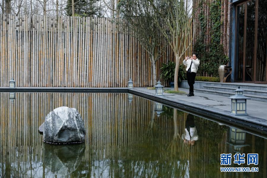 在位于岷江村的“淼兮”帐篷客酒店,一名从四川省阿坝州慕名前来参观学习的民宿从业者在拍摄酒店里的景观(3月1日摄)。岷江村的民宿产业已经小有名气,吸引不少外地同业者前来参观学习。新华社记者 沈伯韩 摄