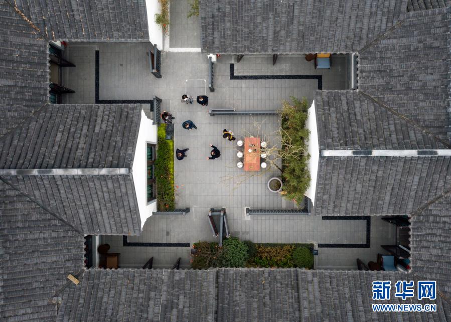 在位于岷江村的岷江书院,陶勋花(右二)向参观者介绍这里用于住宿的合院(无人机照片,2月26日摄)。新华社记者 沈伯韩 摄