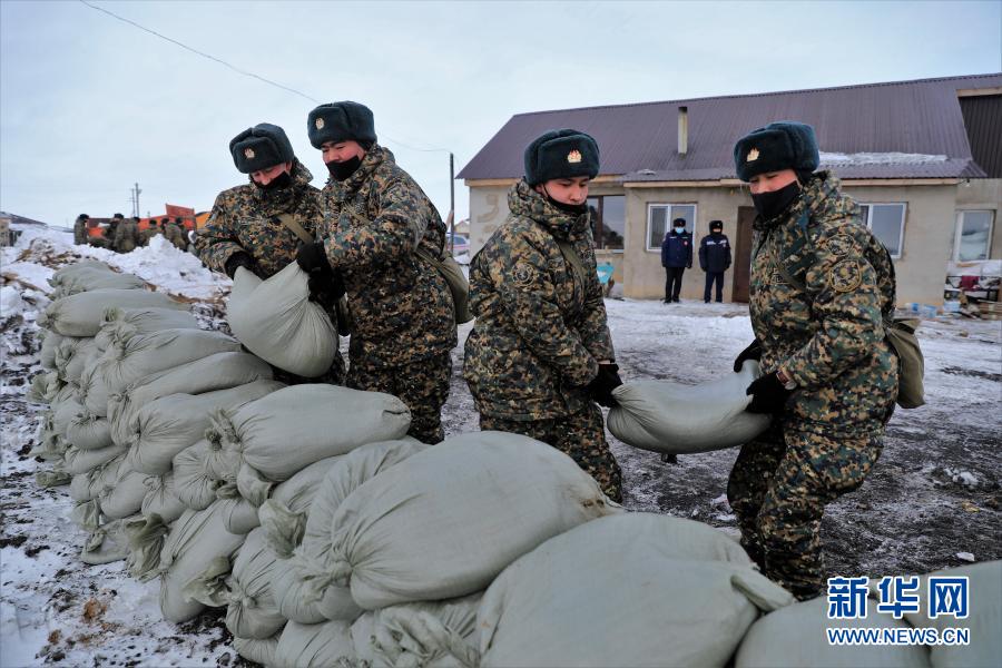 3月4日,哈萨克斯坦士兵在巴甫洛达尔市构筑防洪工事。